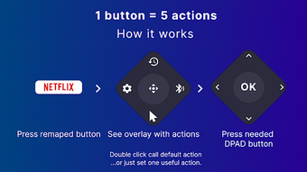 tvQuickActions เป็นโปรแกรมสำหรับกำหนดปุ่ม/คีย์ที่ออกแบบมาเฉพาะสำหรับอุปกรณ์ทีวี รองรับกับ Android TV, Google TV, และ AOSP บนอุปกรณ์ต่าง ๆ รุ่นต่าง ๆ รุ่นฟรีนี้มีความสามารถในการกำหนดการทำงานได้สูงสุด 5 การกระทำกับปุ่มรีโมทของคุณ เพิ่มความสามารถของอุปกรณ์ของคุณ แม้แต่ถ้าคุณมีปุ่มที่ไม่ได้ใช้งาน คุณก็สามารถกำหนดฟังก์ชันที่มีประโยชน์ให้กับพวกเขา และด้วยการคลิกสองครั้ง คุณสามารถดำเนินการดีฟอลต์ได้